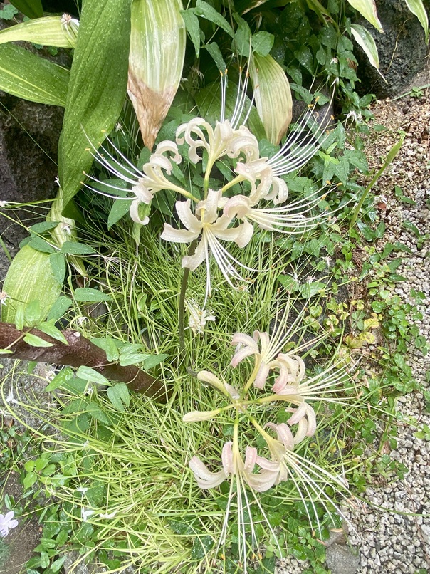 秋の彼岸会の日にほころびはじめた白い彼岸花が、見頃を迎えました。これからつぼみも次々に咲いていきます。